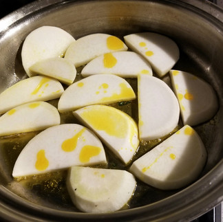 リタの表の道路にて、今月は土曜日にうたか自然農園さんのお野菜販売を行って毎週大変賑わっています! そこで販売されているうたかさんの黒丸大根をこのカレーオイルでじっくり蒸し焼きに!